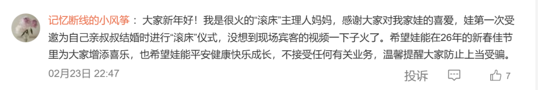 “滚床”视频走红后,疑似孩子姆妈的网友“牵挂断线的小风筝”在该条微博辩驳区发声:不收受任何联系业务,温馨指示全球别上当上当: