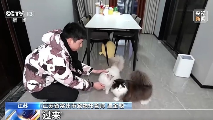 温金朝在江苏省常州天宁区打算着一家社区宠物店,本年春节,店里60只宠物寄养限额早已满员,于是他新增了上门喂养处事。傍晚六点,他准时来到客户家中,顾问两只名为“包子”和“米线”的小猫。