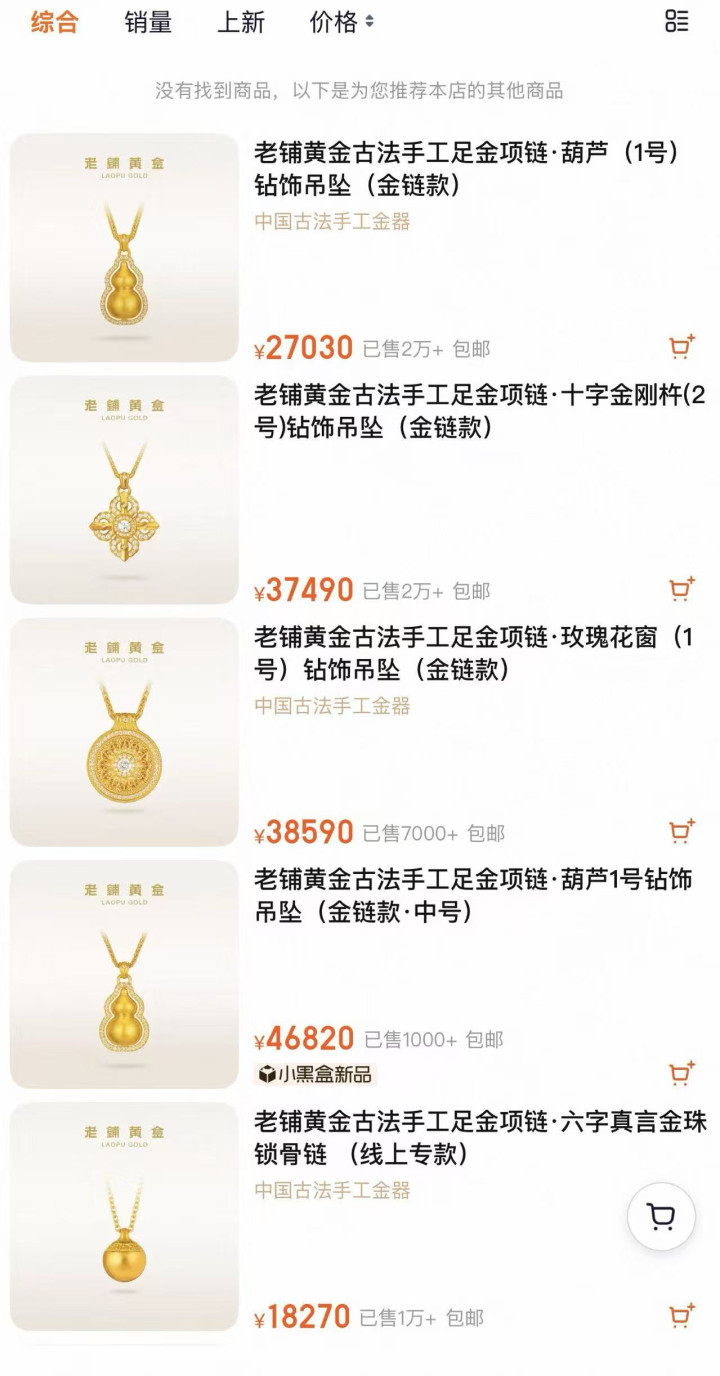 3月11日,界面新闻在老铺黄金天猫旗舰店发现,一款售价27030元起的黄金古法手工足金项链已售2万多件,另外一款售价37490元起的十字金刚杵足金项链也已售2万多件。此外,上述保藏级单品还是无法在店铺搜索到。