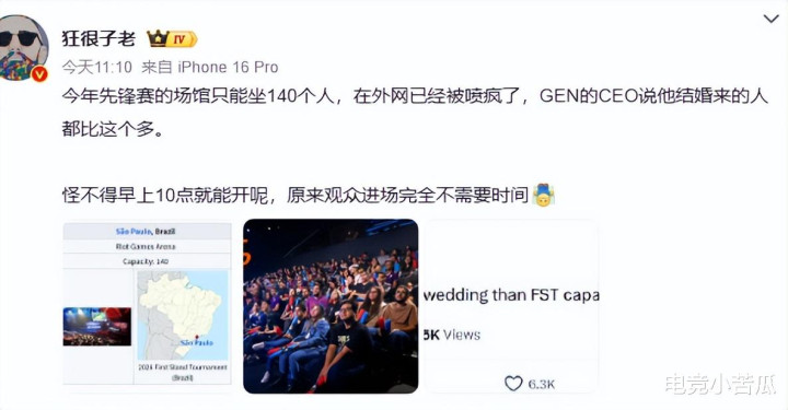 不外看到时尚赛的场馆曝光之后,公论升起了,140个东说念主的场馆,拳头官方是负责的吗?那么远跑到巴西,恶果这样小的场馆,难怪GEN高层王人吐槽,还莫得我婚典的东说念主多。