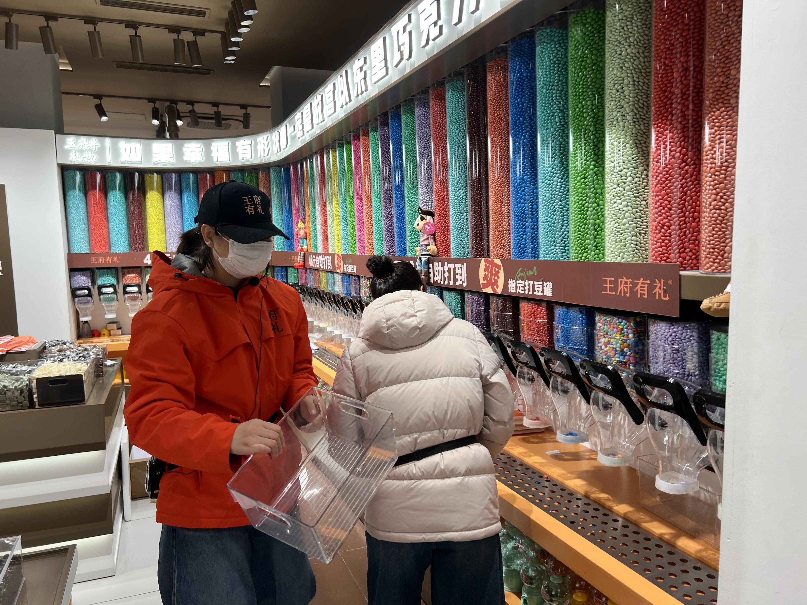 沿着参不雅道路走进店内,布满一整面墙的彩色巧克力豆收拢了每个东说念主的眼球。在一个打豆罐前,小一又友正在家长的匡助下出手打豆,轻轻扳一下开关,彩色的巧克力豆就哗喇喇地从罐子里滚出。