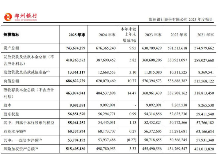 从畛域看,截止2025年末,郑州银行总资产达7436.74亿元,同比增长9.95%,这一增速创下2018年以来新高。更要紧的是,资产畛域在一季度冲突7000亿元后,连气儿三个季度保持隆重增长势头,全年增量达673亿元。这种逐季递进的增长节律,反馈出银行内生增长动能的还原,而非依赖季末冲量等短期时刻。
