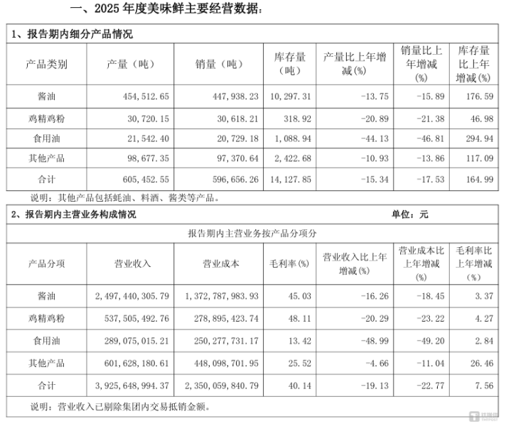 先看2025年年报的中枢承压点,调味品业务的继续疲软是主因。看成公司的中枢盈利扶助,可口鲜的产销数据出现大幅下滑,成为营收与利润双降的成功推手。