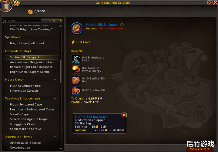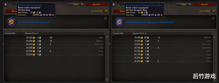 另外,“至暗之夜”的成衣咫尺不错制作更大的包包,有38格的背包“阳炎丝绸背包”和40格的材料包“奥纹材料包”。阳炎丝绸背包比地心之战的暮纹布包多2格,奥纹材料包比晨纹布材料包多2格,两者价钱崇高,咫尺在AH在2W金控制。