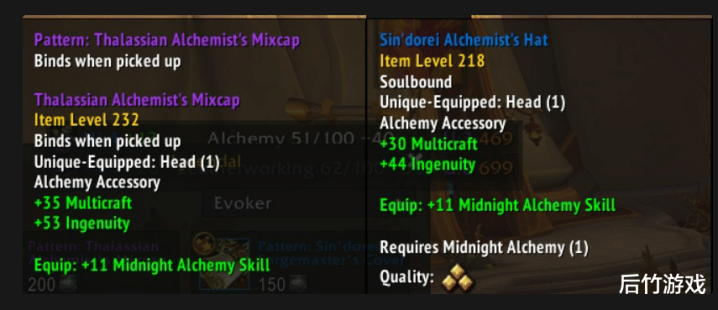 这些专科装备不错大幅进步你的专科时期点数及产出属性。时期是制作高等物品的必要条目,至少可裁汰其所需专注值。每个专科有3个装备栏位:2装备栏+1器具栏。12.0的一套专科绿装可提供18点时期,一套蓝装可加40点时期,饱胀使用。