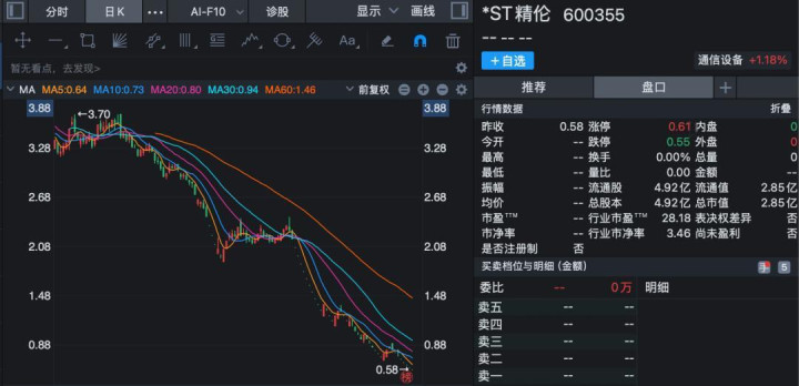 自1月27日起,*ST精伦股价急速下落。在此前一日,公司总市值还越过11亿元,不外在43个往复日之后,*ST精伦股价累计下落近75%。公司股票停牌前的终末一个往复日,*ST精伦股价报0.58元/股,总市值2.85亿元。