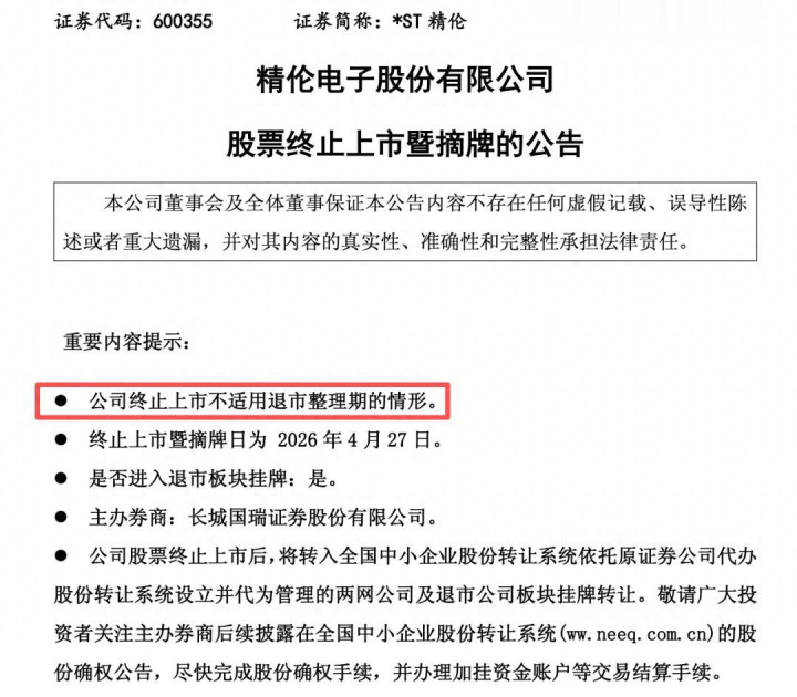 4月20日,*ST精伦(600355)收到上交所出具的决定书:上交所决定拒绝公司股票上市。*ST精伦股票将于2026年4月27日拒绝上市暨摘牌,同期往复类强制退市公司股票不投入退市整理期往复。