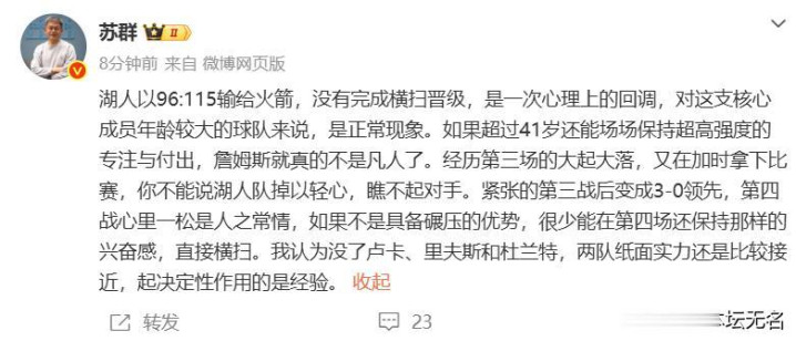 很彰着,苏诚笃以为湖东说念主将最终赢下系列赛,下一场G5很关键,不仅主场作战,里夫斯可能也会复出,况且在4月30日进行,詹姆斯赢得两天的休息技能,实足让体能收复到最好了!